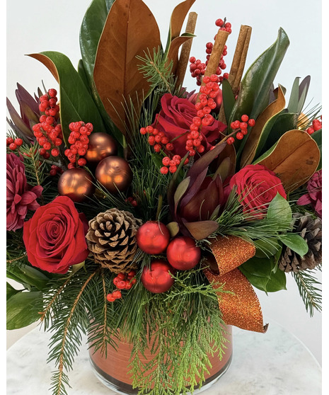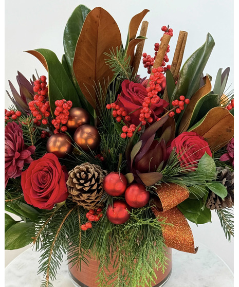 Rich, warm, and full of seasonal charm, Crimson and Copper brings the cozy glow of winter indoors. A copper leaf–lined vase enhances the deep tones of red roses, cremons, and vibrant ilex berries, while leucadendron and magnolia leaves add earthy texture and depth. Shimmering copper and red ornaments, cinnamon sticks, and winter greens create a festive, luxurious finish. Bold and elegant, this arrangement captures the beauty and warmth of a glowing winter hearth.