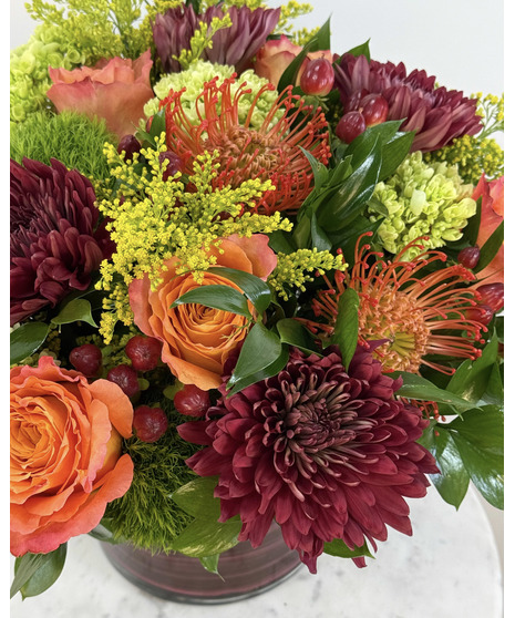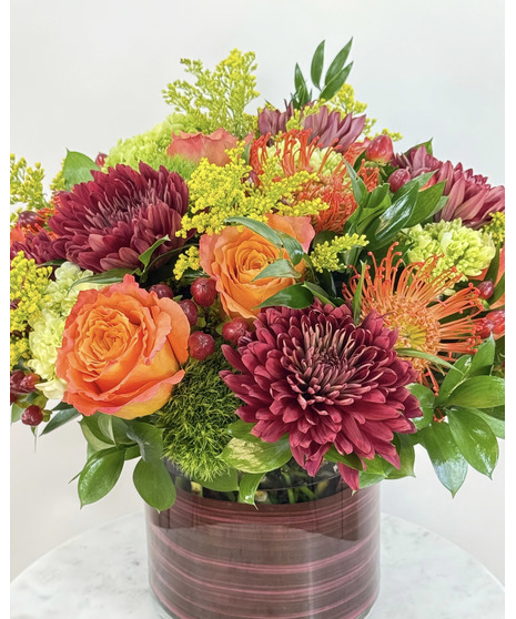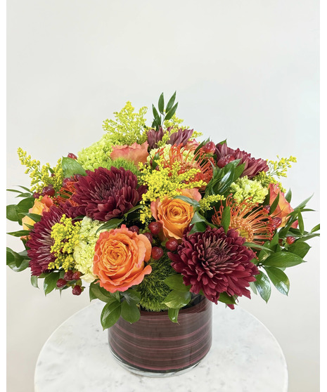 Bold and elegant, Crimson Harvest captures the essence of autumn’s brilliance in a striking red leaf–lined cylinder vase. Vibrant orange pincushion protea and roses glow against the depth of red cremons, while clusters of autumn berries add warmth and texture. Fresh green hydrangea and dianthus bring a lush contrast, accented by golden sprigs of solidago that echo the season’s light. Rich, radiant, and full of depth, this arrangement is a glowing tribute to fall’s abundance and beauty.