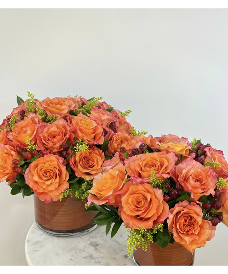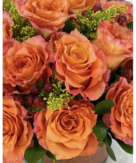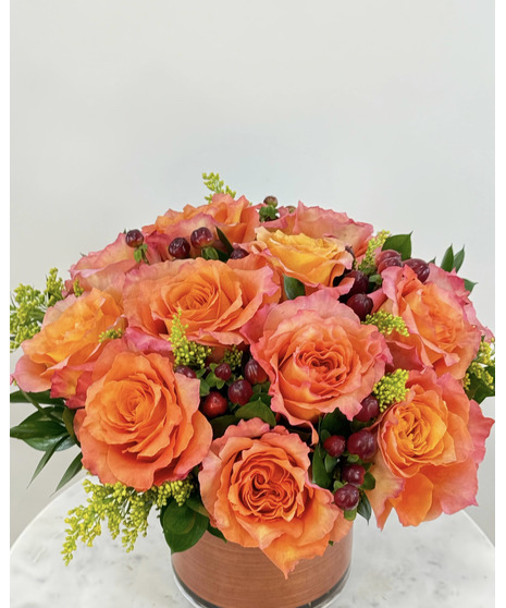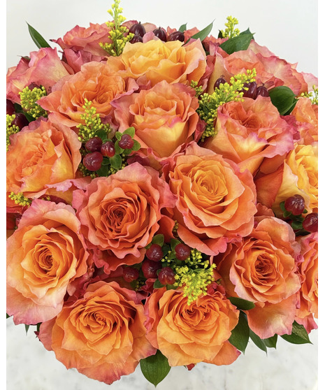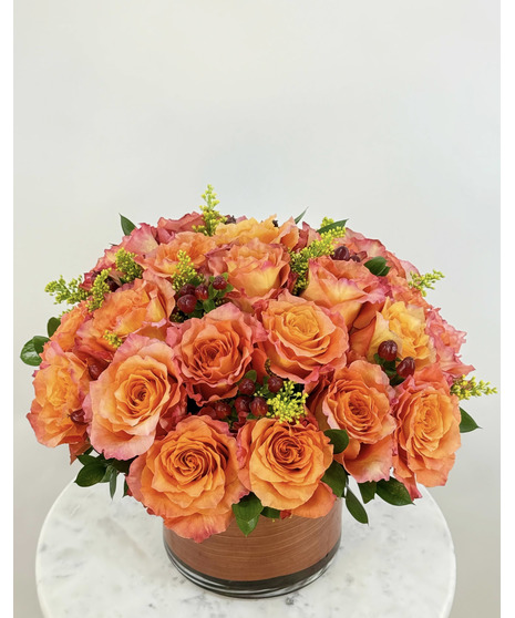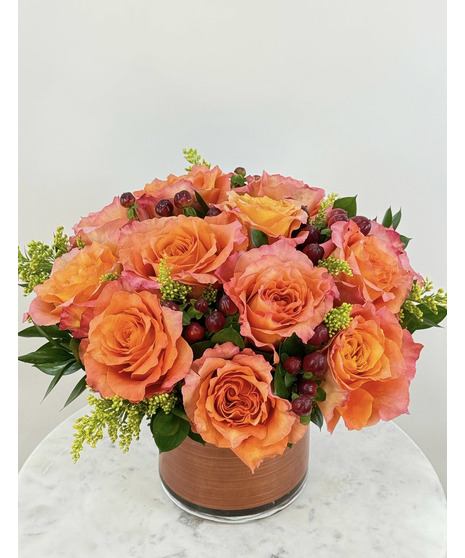 Blazing with autumn beauty, Fiery Fall Roses features vibrant orange roses arranged in a shimmering copper leaf–lined vase. Golden filler and clusters of berries add seasonal warmth and texture, making this bouquet as radiant as the fall foliage itself. Available in one dozen, one and a half dozen, or two dozen roses, it’s a striking way to celebrate the season or share a heartfelt gift.
