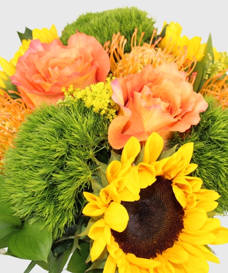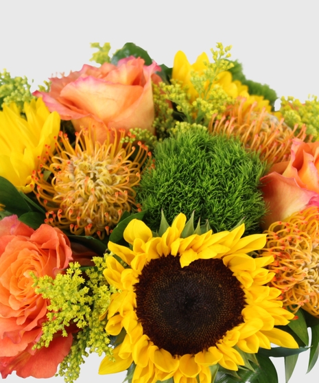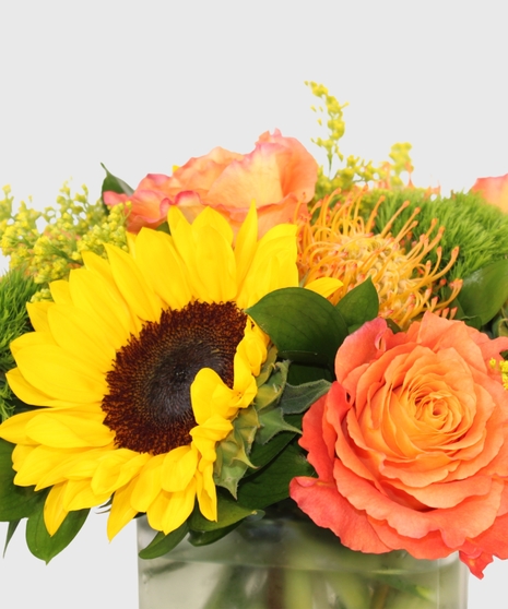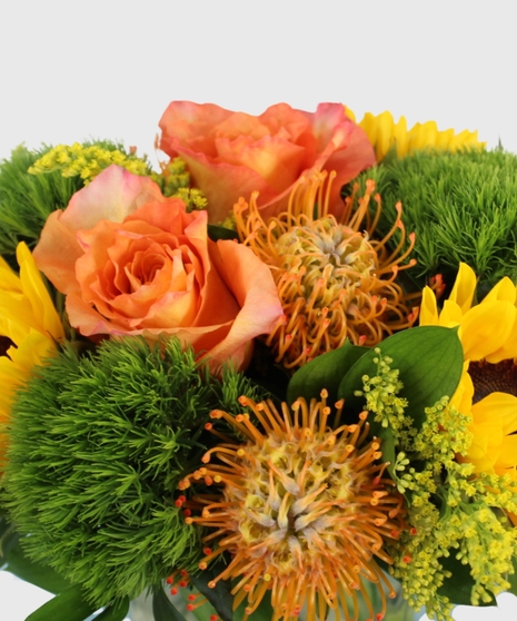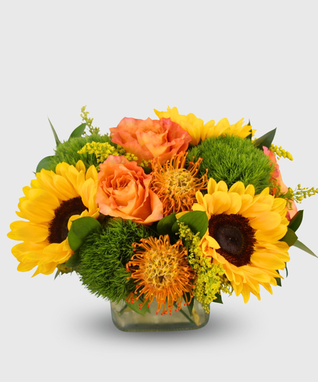 Warm and radiant, Golden Harvest captures the beauty of fall in a modern clear block vase. Featuring vibrant orange roses, striking pincushion protea, cheerful sunflowers, golden solidago, and playful green dianthus, this design overflows with seasonal charm. Available in both petite and large sizes, it’s the perfect arrangement to bring autumn’s glow to any table, gathering, or gift.