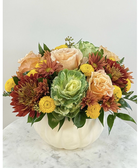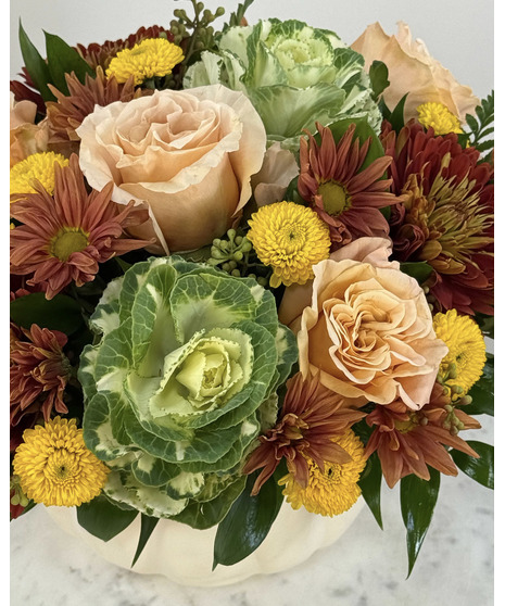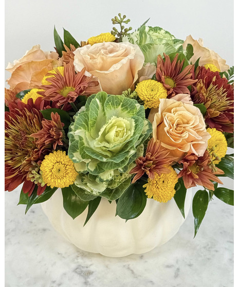 Inspired by the soft glow of autumn evenings, Harvest Moon is arranged in a white ceramic pumpkin for a fresh, elegant take on seasonal décor. Lush peach roses mingle with textured kale, while bronze and yellow mums add warmth and richness. A harmonious blend of color and texture, this arrangement makes a stunning centerpiece or thoughtful gift to celebrate the beauty of the harvest season.