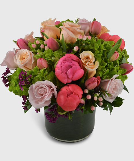 Velvety blush and apricot roses intermingle with coral and deep pink peonies and tulips, and bunches of peach hypericum berries, artfully arranged with stunning green hydrangea, sprays of deep pink waxflower, and seasonal greenery. We skillfully arrange The Memento Bouquet in a leaf-lined cylinder vase.
