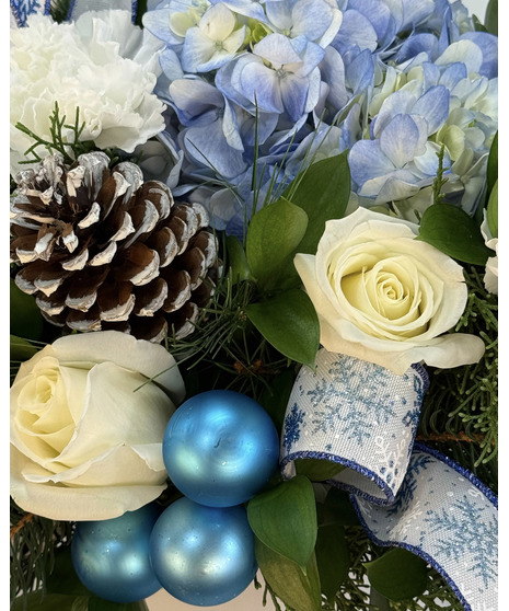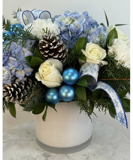 Elegant and enchanting, Midnight Snowfall captures the quiet magic of a winter evening sky. Lush blue hydrangea and snowy white roses and carnations nestle into fragrant winter greens, creating a rich, frosted palette. White-tipped pine cones, gleaming blue ornaments, and a decorative blue-and-white ribbon add festive sparkle and depth. Designed in a clean white cylinder vase, this arrangement brings the beauty of a snowy night into any home — timeless, serene, and full of holiday charm.