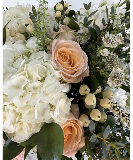 Soft, elegant, and timeless, this arrangement features lush white hydrangeas, delicate peach roses, white stock, and wisps of white veronica. Accented with white hypericum berries and a touch of fresh greenery, including ruscus and eucalyptus, all beautifully arranged in a chic white cylinder vase. Perfect for celebrating love, life, or special moments with effortless grace.