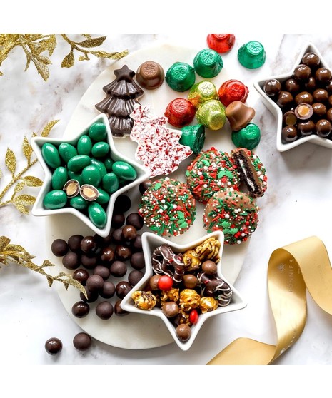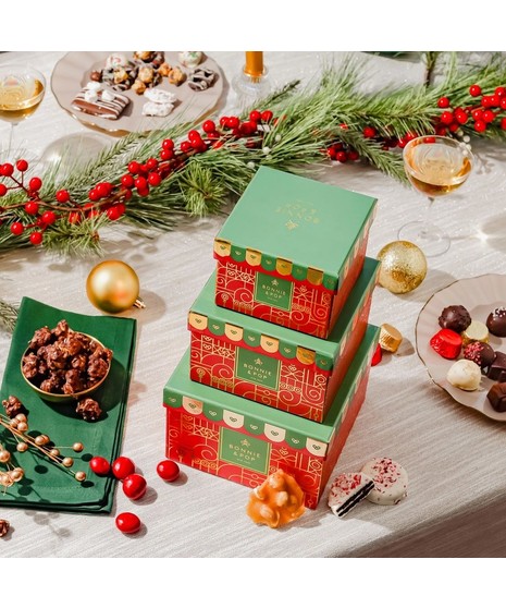 Gift elegance and flavor with this show-stopping Christmas gift basket — a three-tier tower wrapped in shimmering gold ribbon. Each tier reveals a selection of indulgent holiday favorites, including Belgian truffles, buttery caramels, toffee bites, praline peanuts, cookies, and chocolate-covered pretzels. Every item is individually wrapped to preserve freshness and make sharing easy. Features & Benefits Stunning Three-Tier Display – Perfect as a festive centerpiece. Rich Gourmet Variety – Chocolates, nuts, caramels, and cookies. Easy Sharing – Individually wrapped portions for convenience. Gift-Ready – Elegant packaging requires no wrapping. Highlights Luxurious Christmas gift basket that impresses visually and deliciously. Artisanal chocolates and decadent seasonal confections. Combines elegance with instant holiday indulgence. Ready for gifting straight out of the box. Ideal For Large family gatherings Corporate or client gifting Holiday parties Hostess gifts that wow.