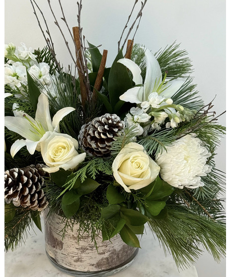 Soft and serene, Winter’s Whisper captures the quiet beauty of a snowy woodland morning. Pure white lilies, roses, cremons, and stock gather gracefully among fragrant winter greens, creating a lush, frosted palette. Natural pine cones, cinnamon sticks, and sculptural branches add earthy texture and warmth. Designed in a birch leaf–wrapped cylinder vase, this arrangement brings the peaceful whisper of winter woods into any home — elegant, organic, and timeless.
